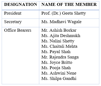 | Office Bearers | Mr. Ashish Borkar Ms. Ajita Deshmukh Ms. Nalini Shetty Ms. Chaitali Mehta Ms. Payal Shah Mr. Rajendra Sanga Ms. Joyce Britto Ms. Pooja Shah Ms. Ashwini Nene Ms. Shilpa Gandhi |