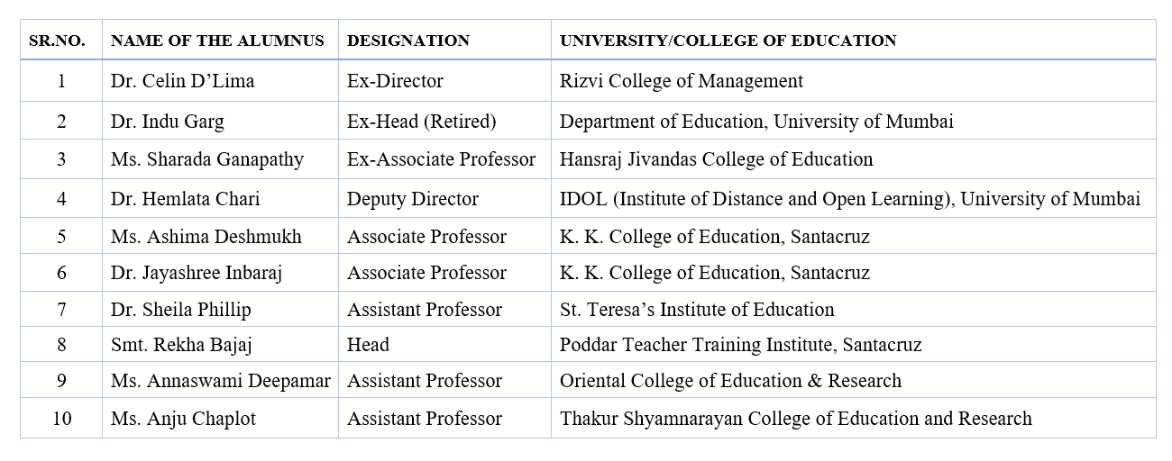 | Dr. Geeta Shetty | Associate Professor | St. Xavier’s Institute of Education |